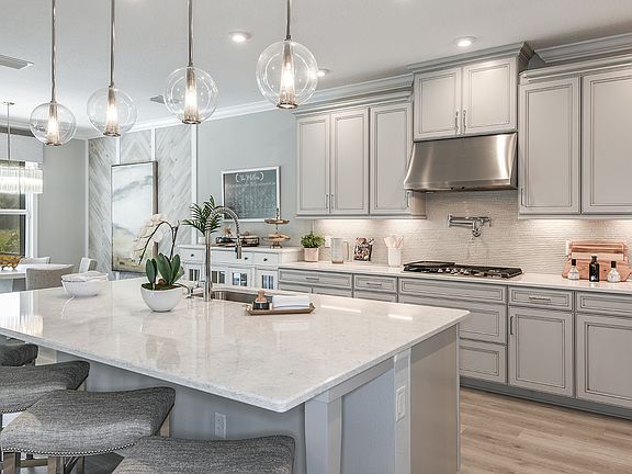 The Sand Key is an exceptionally-designed, two-story home with all the space, features, and offerings that modern home buyers seek out. As you enter the remarkable home, the foyer makes a great first impression. As you come in, you are within the line of vision of a formal dining area, staircase, and study. Hosting your most entertaining evenings will ultimately be a breeze, as there is a seamless passage from the dining room to the kitchen. Relax and enjoy the company of your guests with those dishes out of sight and out of mind. And, for ultimate convenience, a powder bath is tucked behind the stairs.We know that loved ones love to congregate around the kitchen at any type of gathering. That's why we've designed the spacious kitchen to function as the rightful heart of the home. The expansive counter space provides plenty of space to spread out your appetizers and your buffets of delicious treats. There is also plenty of additional space within the sun-soaked casual dining room. The walk-in pantry will keep all your essentials organized. The kitchen overlooks the gathering room providing a natural flow to mix and mingle. Large sliding glass doors fill the room with natural light and lead you out to the vibrant Florida sunshine. The covered lanai is the perfect spot to host barbecues for true indoor-outdoor living.The primary bedroom is your private retreat downstairs. Relax in a light and airy bedroom. The suite includes a large spa-style bathroom with separate vani