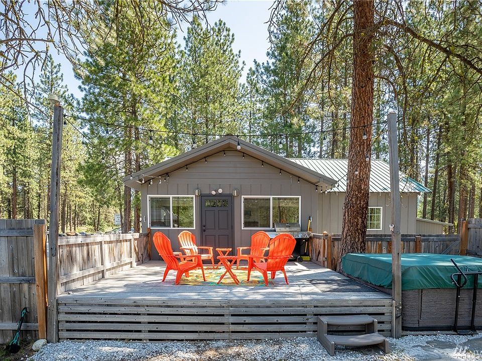 Set in age-old Pines, this is a rarely available cabin in the adventurous mountain community of Plain. Charming, updated, 2-bed/1-bath cabin features a beautiful gas fireplace built from river rock and a privately fenced backyard with a hot tub. The spacious ADU offers room for a queen-size bed, has a 3/4 bath and laundry connection. Perfect opportunity for rental income or entertaining out of town guests. Lots of year-round, nearby recreation opportunities to make memories for years to come.