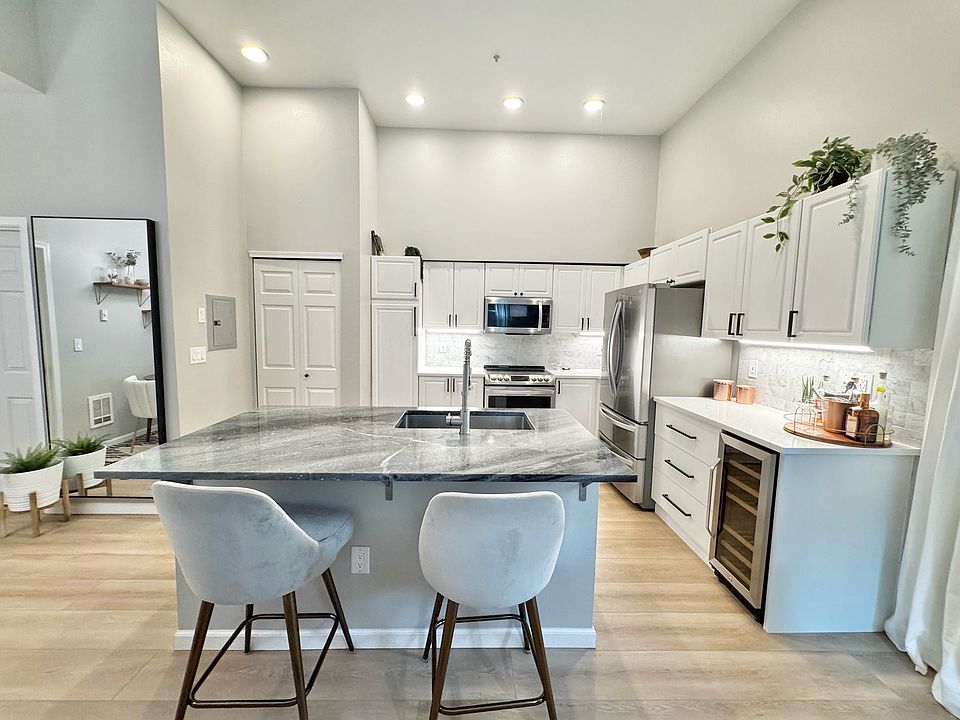 Experience luxury living at its finest in this recently renovated 1b1b condo, featuring soaring 12-foot ceilings and high-end finishes throughout. The giant, chef-inspired kitchen boasts a large quartzite island and a wine bar with a built-in wine fridge perfect for entertaining. Relax in the spacious living area, where the gas fireplace creates the perfect ambiance for cozy evenings or quiet nights in.