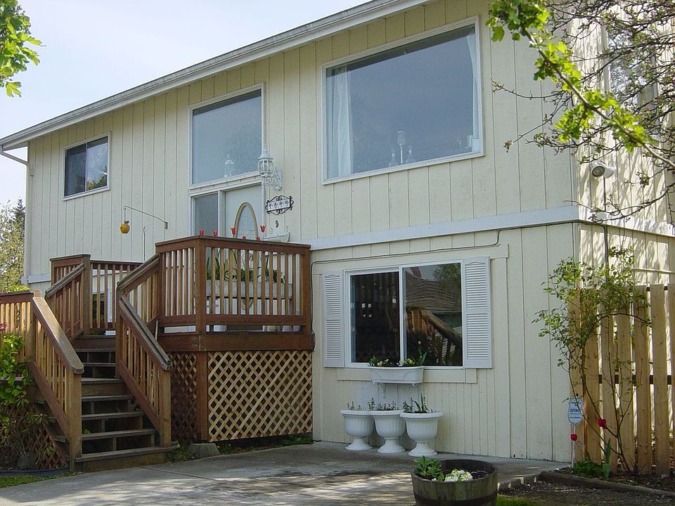 This bright & spacious 3+ bedroom, 2 bath home is situated on 3 city lots. Tastefully updated throughout, gas fireplace w/Italian marble surround & a unique whale etching in the center,tile in bathrooms, central air & more! New deck off the kitchen and dining room overlooking beautifully landscaped yard, new cedar fencing w/ several fruit trees & a peek a boo view of bay too. Large room downstairs possible for 4th bedroom or MIL. Alley access with room for potential garage. Neighborhood Description Unique homes in Old Town. Lots of variety in design and construction eras. Close to downtown, but peaceful.