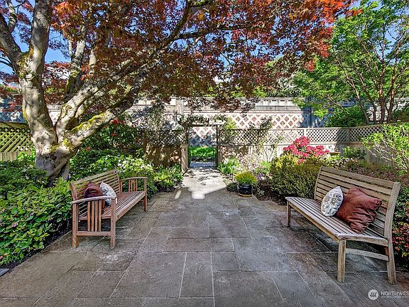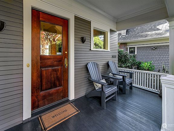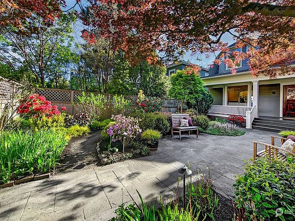 Classic, top-of-the-hill craftsman tucked back from the street for maximum privacy is where you want to be. Enter into welcoming foyer adjacent to the light filled living room overlooking the spectacularly landscaped garden. Spacious dining room's french doors open onto the perfect entertainment deck with peaceful sound & mountain views. Views only get better on the upper level with the ideal floor plan: oversized primary suite with walk-in closet, balcony & 3/4 bath, 2 addtl bedrooms & full bath. Thoughtful & beautiful details throughout. Lower level has guest space/office, full bath, workshop, & laundry. Covered walkway leads to true 2-car garage with alley access. Just blocks to Macrina, Ken's Market, parks, the smoothest commutes, etc.