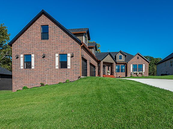 This all brick Executive Home was built in 2023. Owners are being transferred out of state and regretfully leave this semi-custom home. Seller is offering $10K at closing to aid buyer with closing costs or rate buy-down! This stunning 4 bdrm, with a main-floor master, plus office/5th bdrm, 3 bath home has custom features everywhere! 3,161sf of living area including a massive open living rm with a brick-faced gas fireplace, huge wood mantle, and shiplap to the 13' cathedral ceiling which features magnificent wood beams. The open kitchen and dining rm are set up for the discerning chef. White GE Cafe appliances, granite counters, huge pantry, and custom lighting. This home has a flexible floor plan sure to please any home buyer. Walking through the designer front door, you are greeted by a large entry with a drop zone and real hardwood floors that extend throughout the main level of the home. To the left is a powder bath, the stairs to the upper rms, and the 4th bdrm. To the right is a secondary hall with 2 of the guest rms with walk-in closets and a full bath. A second hall on the right is a private master wing complete with a full-sized laundry room. The master suite features a tray ceiling, a huge walk-in closet with wood shelving, and a roomy bath featuring a tiled walk-in shower, double-sink granite vanity, soaking tub, and water closet. The finished upstairs has almost 700 sq.ft. of space, including a bonus rm with built-ins and studio/office/5th bdrm. The second furnace-A/C unit is for this area. The covered deck overlooks a private backyard backing up to a small field with mature trees making for a wonderfully quiet place for your morning coffee. The garage is oversized at 899sf! - plenty of workshop space. The mechanical rm, with storage, and access to the dry crawl space is also here. The entire yard has sprinklers, landscaping, and sod. Ozark East schools. Historic Finley Farms, outdoor aquatics Frisbee and ball fields are in walking distance