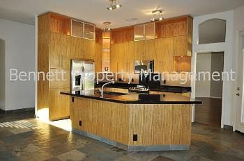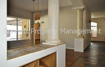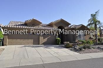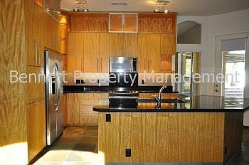 Absolutely gorgeous, single level split floor plan, 3 bedroom, 2 bathroom home with office. Formal living room has fireplace and formal dining area. Family room off of the updated kitchen with custom cabinets, granite counter tops, breakfast bar and all appliances included! Master bedroom is split, has door leading out to the backyard, spacious master bath has been recently updated, separate shower/tub, double vanity with custom cabinets, walk in closet has lots of shelving! Hardwood, slate floors and ceiling fans throughout. An entertainers dream backyard has steps leading up to the sparkling negative edge pool, lots of mature landscaping, putting green, built in grill, huge extended covered patio, detached storage/workshop. 3 car garage! Hiking trails in walking distance. Small pet may be considered!