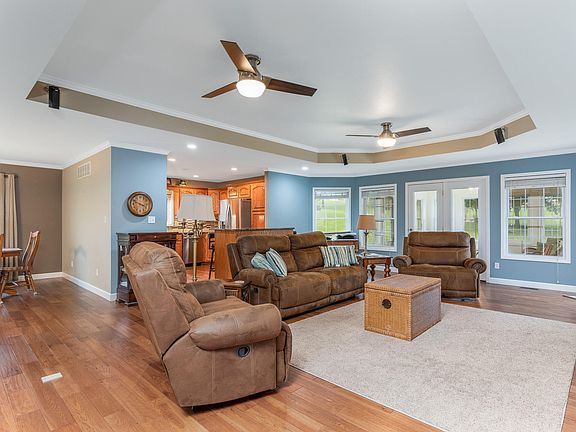 Ranch style home in Blair Oaks School District. This home offers many nice features. Walk into a large open living room, dining room, and kitchen. The Kitchen offers granite countertops, large eat in island, new appliances, and awesome lighting. Just off the living room is an awesome 4 seasons/sunroom. Large patio outback with a firepit. Flat park-like backyard. The main level offers a full hall bath, laundry just off it, and laundry goes directly into the master closet. Master suite offers large walk in closet, jetted tub, tiled shower, and double vanity. 3 total bedrooms on the main level. Basement offers a large family room, and large wet bar with lighting in the cabinets. 4th bedroom downstairs. Home offers a 2 car main level garage and basement garage. Call to see today!