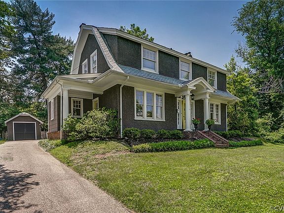 Talk about curb appeal! This beautiful Dutch Colonial, which sits on a deep lot in the sought-after Bellevue neighborhood, has it all, including a deep-eaved gambrel roof and a stately classical portico that invites you inside with elegant style. In all, it offers more than 2,300 square feet of living space, renovated with attention to quality and detail. On the first level, the entrance hall opens onto a living room with a fireplace and a formal dining room with custom built-ins. A pair of French doors in the living room opens onto a space that could be a great family room or home office. The kitchen features maple flat-panel cabinets, granite counters, tile backsplash and stainless appliances, as well as a pantry. A breakfast room and a powder room complete the first level. The second level has three bedrooms, including a primary with a walk-in closet. The tiled hall bath has been renovated. The lower level has a family room/rec room, utility room and storage. 9' ceilings. Wood floors throughout. Two-zone HVAC. The fenced rear yard has a one-car detached garage, large planters for herbs and a patio that's perfect for outdoor entertaining. Just move in and water the geraniums!