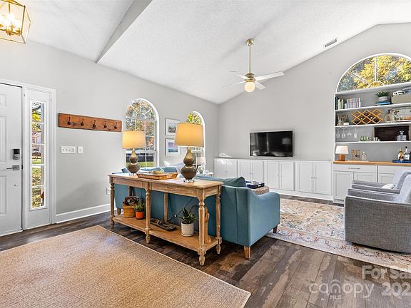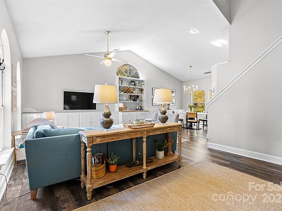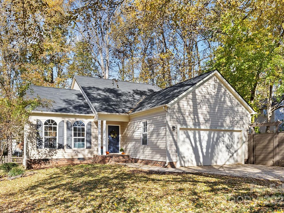 Tucked at the end of a peaceful cul-de-sac in Harvest Pointe, this well-maintained home blends thoughtful updates with everyday comfort in one of Huntersville’s most convenient locations. Part of the sought-after Hough High School district, it’s surrounded by mature trees, long-established neighbors, and easy access to parks, shops, and commuter routes. Step inside to a bright, open main level featuring soaring ceilings and natural light. The living and dining areas include built-in cabinetry, adding character and practical storage. The primary suite on the main floor offers privacy and a full bath, while upstairs you’ll find two additional bedrooms, fresh carpet, and a large walk-in attic providing exceptional storage or potential flex space. The kitchen flows easily into the living area and features freshly painted cabinets and updated lighting in the entry, dining, and kitchen. Additional recent improvements include a new roof (2022), new exterior shutters and rear door, new HVAC outdoor unit (2023), and furnace (2018), plus neutral interior paint for a clean, move-in-ready feel. The heated and cooled two-car garage, finished with drywall and ceiling, offers a versatile space for hobbies, workouts, or projects while still functioning as a garage. Outside, a fully fenced backyard provides both sun and shade thanks to mature trees that create natural privacy. A long driveway allows for ample parking. Enjoy no HOA restrictions and Google Fiber connectivity while living steps from walking trails, North Mecklenburg Park, and The Farm House at Spring Water Farms. Experience the rare combination of flexibility, function, and location where thoughtful design meets everyday practicality in a quiet, well-connected setting.