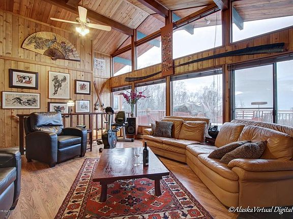 !!!OWNER FINANCE CONSIDERED/warm, inviting, Alaskan rustic ambience/15-foot ceilings/west-facing window walls/panoramic vista of Cook Inlet, Alaska Range, Kenai Peninsula, Mount Susitna, Foraker, Denali, and Anchorage bowl/young roof & heating system/designated parking for recreational vehicles + extra automobiles/en suite baths for each bedroom/3,000 SF multi-tiered decks/
