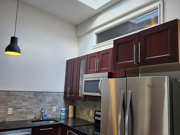 Upgraded apartment with stainless steel appliances, wood floors, open concept with in unit washer and dryer. Master Bedroom has en suite bathroom and back deck. Super high ceiling and sky light with beautiful sunrises. Apartment has endless storage space.