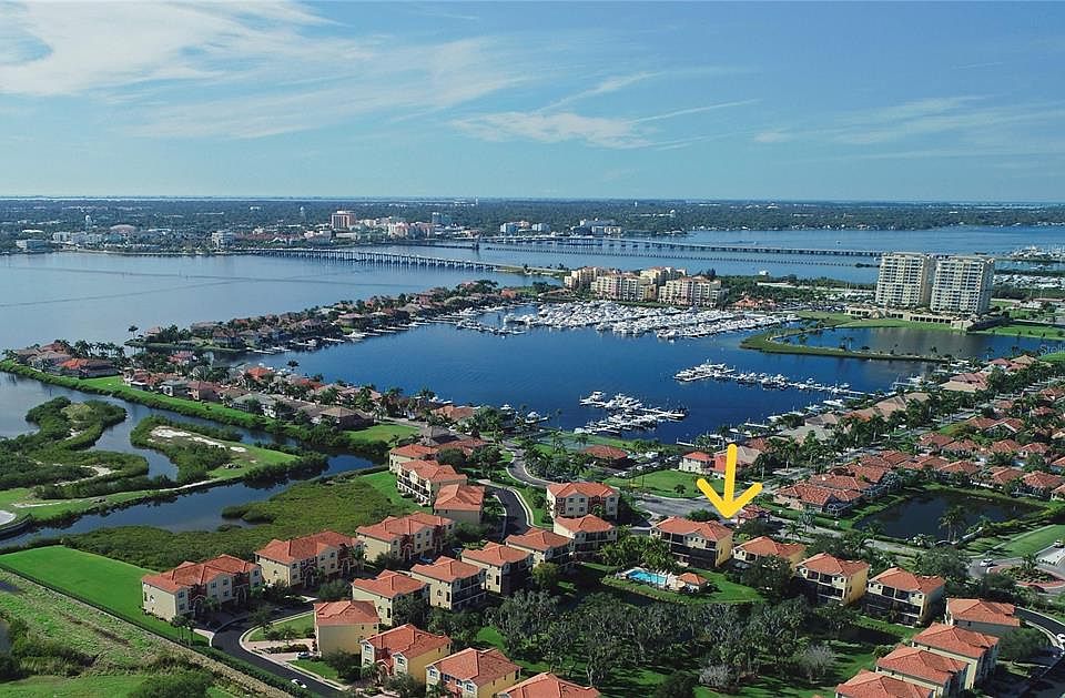 BACKUPS REQUESTED - HIDDEN OASIS! Wake up & step out onto your private third floor east-facing balcony nestled in swaying palms, live oaks and tropical plantings. Listen to the sounds of the fountain; watch the waterbirds play in the pond. Enjoy the awesome view from your new home’s 2nd & 3rd floor balconies & even from the shower in your big rear master suite. Later, peek out your front windows to watch the setting sun paint the sky & the harbor. Biggest home footprint available -- under a million dollars – in a harbor community with direct access (no lifts needed) to Manatee River. Over 2,800 square feet with private elevator (over 3,600 sq. ft. with the garage, etc.) in a beautifully maintained, low maintenance community. You are only a short walk to Riviera Dune’s deep-water marina. Boat slips are often available for lease or purchase. Flexible floorplan provides 2-4 bedrooms &/or office-space for remote work - with 4 full baths. The 1st-level "semi-private" 2-room suite (with full-bath & walk-in closet) is perfect for guests, family members, office(s), etc. Use your private elevator to bring your groceries up from your 2-car garage to your 2nd-level gathering-room with open plan living, dining, and kitchen - with tile floors. Kitchen features: granite counters, updated custom cupboards & tile backsplash, newer stainless-steel GE appliances, & natural gas for cooking. The 2nd level also contains a separate room for use as formal dining room, office, or bedroom, plus a full bath. 10' high ceilings & 8' double sliding doors across the entire east side of the open space provide amazing sunlight. The 2nd level leads out to a large balcony with a natural gas grill inside the 2-story screen-enclosure (protected by “no-see-um” screening). Your day’s stress will instantly drain away as you look out to your “backyard” with one of the two community swimming pools. Almost like having your own “estate” – without the work. The 3rd level has 2 master suites: Rear master with tiled balcony, big master bath, and huge walk-in closet. This master bath was just redesigned with built-in sitting area, new vanity cabinets, extra storage, new 20” marble-patterned porcelain floor tiles, dual sinks, and walk-in shower. The front 3rd-level master also has its own ensuite bath. Laundry room is convenient on 3rd floor. Home’s features include natural gas HW heater & furnace; 2 ACs (replaced in 2016 & 2019); lots of closets & storage; ceiling fans; 2-car garage, pavers, 2 balconies & patio, & more. Stay fit! 2 community pools, well-appointed fitness center, tennis/ pickleball courts, walk to tiki bar restaurant thru unique lakeside trail. Award-winning Florida charter school for the arts (grades 6-12) is just a short walk. Rivera Dunes is a gated community with an 80-acre protected marina leading directly (no locks) to Manatee River/Tampa Bay & out to the Gulf. Live here on permanent vacation, and yet be close to Sarasota/Bradenton/St. Pete/Tampa, I-75 & 3 airports. Easy commute to work/shopping/culture/sports. Quarterly HOA fees include Insurance (both exterior Hazard and external FEMA Flood), Cable TV, internet, 2 Pools, Fitness Center, Tennis & Pickle-ball Court, Exterior Painting, Roofing, Landscaping, ADT Security system monitoring, Fire Sprinklers, Termite bond, Riviera Dunes marina, nature walk, docks, restaurant in harbor, Property Manager, etc. Leave the chilly north. CLICK on the tour links to visit and watch the palms sway in the warm breeze.
