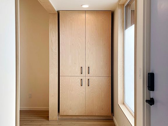 Filled with fresh air and natural light, the open 1-bedroom floor plan features 675 square feet of thoughtfully designed space, 9-foot tall ceilings, gorgeous finishes, and plentiful storage. The 17-foot wide bedroom has a built-in closet and doorway on each end allowing flexibility for a variety of households. A generous living space provides room for relaxation, entertainment, exercise, and/or work. 6-foot tall windows frame views of the Cascades and Mount Rainier and are outfitted with floor-to-ceiling wool curtains and privacy film. A built-in entry closet, linen closet, bathroom vanity with drawers, and open shelving above the side-by-side washer and dryer provide even more storage. Located on the second level of a 3-story walk-up building, access your front door from an exterior circulation balcony shared with only a few neighbors. This independently owned and managed complex contains just 15 units.
