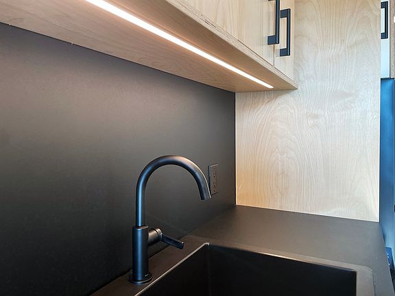 SUNNY CORNER STUDIO WITH NO NEIGHBORS ABOVE featuring an open and airy layout, 9-foot tall ceilings, gorgeous non-toxic finishes, and windows facing south and west. A space-saving murphy bed and built-in closet will help you make the most of the efficient 340-sf floor plan. The 6-foot tall windows are outfitted with floor-to-ceiling wool curtains and privacy film so you can always have the optimal level of natural light while maintaining modesty. A compact but well-appointed kitchen comes with a full-size refrigerator/freezer, 2-burner cooktop, Breville Smart Oven, dishwasher, and microwave.
