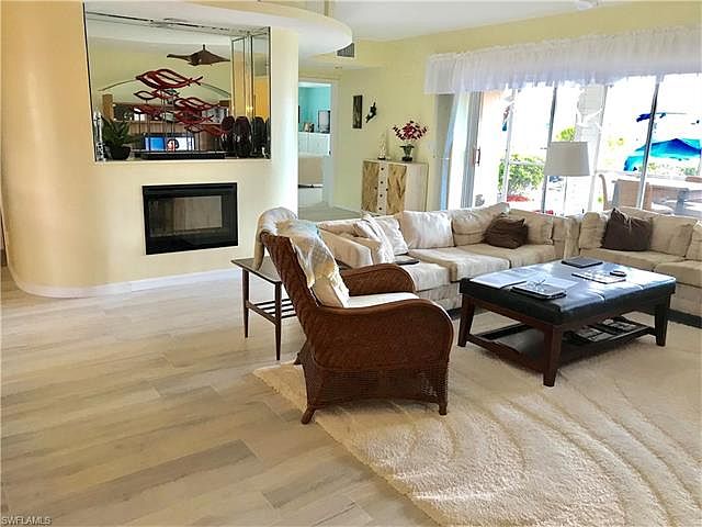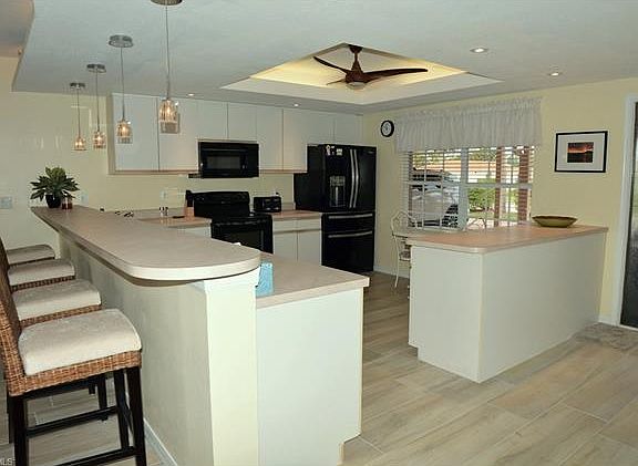 This STUNNING SAILBOAT ACCESS CONDO has a gorgeous view & an assigned boat dock with a 10,000lb recently refurbished boat lift as well as an attached garage. This home features many recent upgrades including beautiful BLEACHED WOOD LOOK plank porcelain tiles in the main areas & a cozy built in Electric Fireplace. The large eat-in kitchen with plenty of cabinets & counter space features rope & cannister lighting as well as pendant lighting over the large snack bar. The Great room floor plan has a 4 panel pocket slider for expansive views and an open concept on beautiful days! The Wet Bar featuring a Bamboo Sink, Beverage Fridge & Wine Cooler is perfect for entertaining. Large master suite has waterfront views, opens to the lanai, a LARGE walk in closet & A GORGEOUSLY UPGRADED MASTER BATH including POURED GLASS DUO SINKS, LG WALK IN SHOWER, COMFORT HIGHT COUNTERS, TOILETS & extra closets. The condo has a large screened lanai with electric roll down shutters. This Community features a heated pool, tiki hut and BBQ area, fishing pier, and expansive views of 200' canal and A MERE 5 MINUTE RIDE TO THE RIVER. The assigned boat dock with lift is INCLUDED in the list price of this condo!!