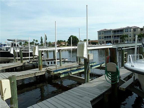 Gorgeous waterfront condo with stunning views, sailboat access, assigned boat dock with 16,000lb boat lift, attached garage. This well maintained condo features large eat-in kitchen with plenty of cabinets and counter space, inside laundry with full size washer and dryer and additional storage. Great room floor plan with wet bar and cove lighting is perfect for entertaining. Large master suite has waterfront views, opens to the lanai, walk in closet, dual sinks with vanity, separate tub and shower. The condo has a large screened lanai with electric roll down shutters and sliders were to give the option of additional A/C living space, new indoor/outdoor carpet just installed in Dec. 2014. Community features heated pool, tiki hut and BBQ area, fishing pier, and expansive views of 200' canal with no bridges. Easy access out. Make no mistake, the assigned boat dock with lift is INCLUDED in the list price of this condo!! Sidewalks lead to community park at end of street. A must see. Easy carefree living in paradise.