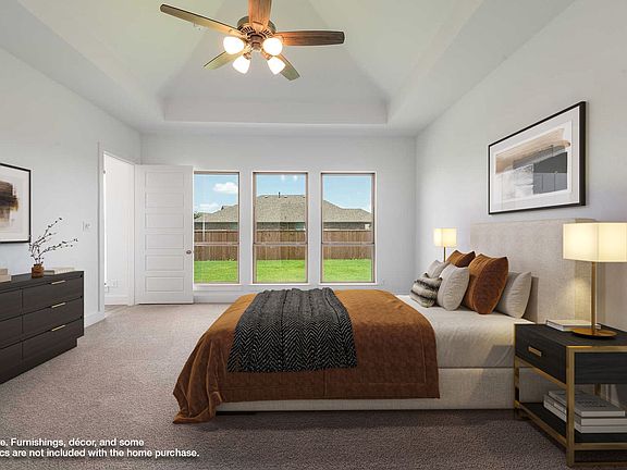 READY FOR MOVE-IN! Home office with French doors set entry. Media room with French doors off extended entry. Formal dining room flows into open family room with wall of windows. Kitchen features corner walk-in pantry and generous island with built-in seating space. Adjoining morning area features wall of windows. Primary suite includes double-door entry to primary bath with dual vanities, garden tub, separate glass-shower and two walk-in closets. Guest suite offers private bath. High ceilings and abundant closet space add to this spacious four-bedroom design. Covered backyard patio. Mud room off three-car garage.
