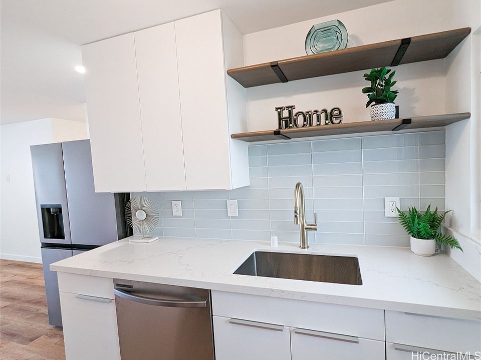 Brand new and move in ready! This completely remodeled 2 bedroom 1 bath unit includes one assigned parking stall. New kitchen with new cabinets, quartz countertops, new stainless-steel appliances including a dishwasher and refrigerator with filter water and ice maker. New washer and dryer in unit. Beautifully designed bathroom and bedrooms. 81 sq ft covered lanai comes with a storage closet. Super convenient location on top of Emerson St, close proximity to downtown, Queens and Straub. Well-kept and secluded building with low maintenance fees. Building features a pool, BBQ/picnic area, and community laundry.