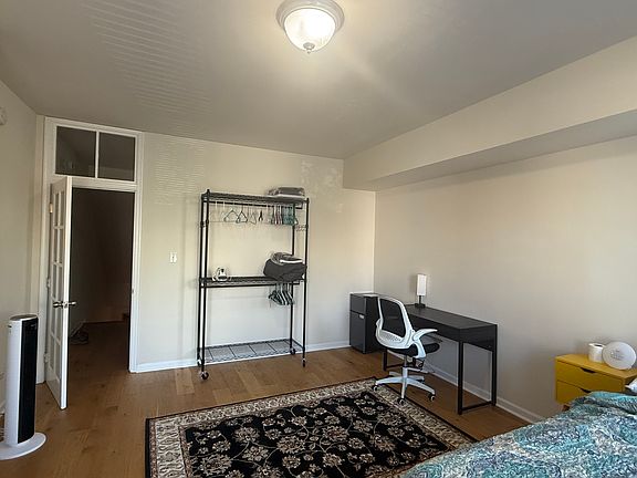 This is a spacious, well-lit bedroom facing the front of the house and comes with a private bathroom. The room comes fully furnished with a dresser, a fan, a TV, an air purifier, a clothes hanging system, a small fridge, and a desk.