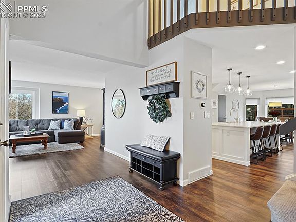 Welcome Home! This incredible 2 story, 3 car, newly stuccoed beauty in Hunter's Point features 6 bedrooms, 3 baths, a kitchen that dreams are made of, and a breathtaking lot! When you walk through the front door you are greated by calming neutral colors, soaring ceilings with skylights, and an open feel that makes everyday living and entertaining a breeze. Newer paint, luxury vinyl flooring, carpet, solid shaker cabinets, quartzite counters, stainless steel appliances, instant hot water dispenser, a dedicated coffee bar, and pantry organization galore are a few of the upgrades! The charming sunroom is the perfect place to relax and soak in the beautiful mountain views. The main level includes a living room as well as a bedroom and bathroom, perfect for a guest room or office. The family room showcases a new gas fireplace and makes for a cozy space for the family to be together. The main level laundry room has a utility sink, hidden storage, and is conveniently located. Upstairs, find 4 bedrooms, including a sprawling primary suite that truly feels luxurious with city views! The attached primary bathroom boasts a spa-like shower and walk-in closet, as well as mountain views you can enjoy while soaking in the tub. The three other generous bedrooms share a full bath. In the basement, find a huge rec-room with limitless possibilities! It is currectly being utilized as an additional family room and work-out room. An additional bedroom, HUGE storage room, and rough-in plumbing for an additional bathroom complete the home. Outside is an oasis! A massive deck, mature scrub oak, grassy areas, and wildlife sightings make this a true Colorado dream. Central air and an attic fan, as well as a newer Decra Stone Coated metal roof, help keep you comfortable year round. The 3 car garage has additional storage and a built-in workbench. Tucked at the end of a culdesac, you enjoy privacy while still being close to award winning D-20 schools.