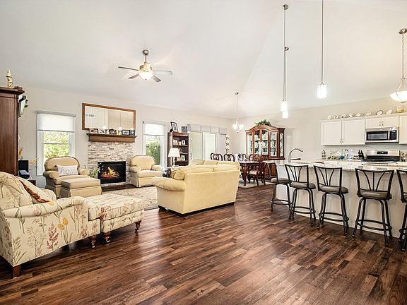 This Villa town home is only 5 years old and located on a cul-de-sac in the sought after subdivision The Forest. The open concept as you walk into the foyer showcases the gas fireplace, custom shades, cathedral ceilings and hard surface flooring through out the main living area. The spacious kitchen with upgraded cabinets, granite counter tops, stainless steel appliances, center island along with a large countertop for seating or for entertaining is the heart of the home. The 3rd bedroom off the foyer is currently being used as a den, the 2nd bedroom and full bath down the hall is perfect for guests. The primary bedroom and en suite located in the back of the home is a retreat with a large walk in closet. The home overlooks a treed backyard from the patio. Great convenient location to shopping and restaurants. HOA fees include lawn, trimming, mulching, snow removal and irrigation.