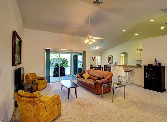 Welcome to this spacious, move in ready 3 bed, 2 bath, 2 car garage, 1705 SqFt waterfront home. The home is located in SW Cape Coral on city water, sewer and irrigation with all assessments paid! This home features cathedral ceilings, a nice bright open floor plan with double front doors and sliders to lanai. It also features a large laundry room, walk in closets, and a very spacious under truss lanai. It's the perfect design to add a pool to! This home is ready for new owners. Call today for your private tour before it's too late.