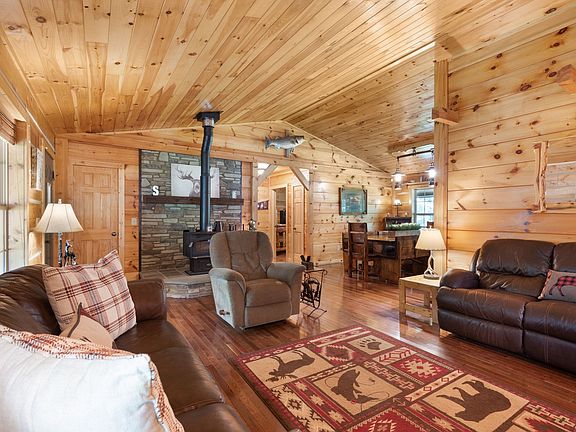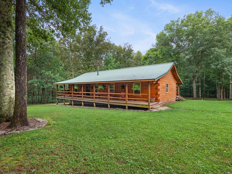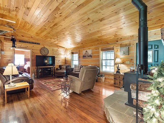 Cabin Life! 3 bedroom 2 full bath log home! Front & back covered porches! 9.48 acres! 50'x40' Barn w/22' ceilings! Built-in workbench, industrial lighting & 13'x13' room w/ AC! 40'x40' Fenced animal area, cleared back yard! Fire pit! Dry creek, deer stand! 2 car detached garage! Walk-in crawl space! Wood floors! Cedar cabinetry, granite, under mount sink and pantry! All kitchen appliances remain!! Custom dining table to remain!