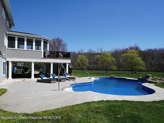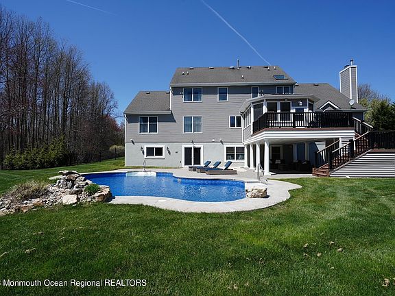 This masterpiece of a 5-bedroom, 3.5 bath home is located on a quiet cul-de-sac in the Sheridan Woods section of Wall Township. Horse farms and a protected reserve surround the property providing a uniquely remote setting for a home which is less than a 10-min drive to the Jersey Shore Beaches. Enjoy easy access to various commuting options. A desirable Wall Township school district including the highly sought Central School. The renovated custom finished basement is an amazing space for entertaining as it opens directly out to the gorgeous inground pool & fire pit. The main floor highlights include wooden floors throughout, a sunken family room directly off the kitchen with gas fireplace, a full dining room, a bonus room with tons of natural light and brand-new hard wood floors, a three-season porch overlooking the pool, a living room, a laundry room/mud room and finally a home office set up perfectly for today's hybrid work environment. The garage has brand new flooring and plenty of space to store all the toys and beach necessities. The 2nd Fl features a primary bedroom & 3 other nicely sized bedrooms