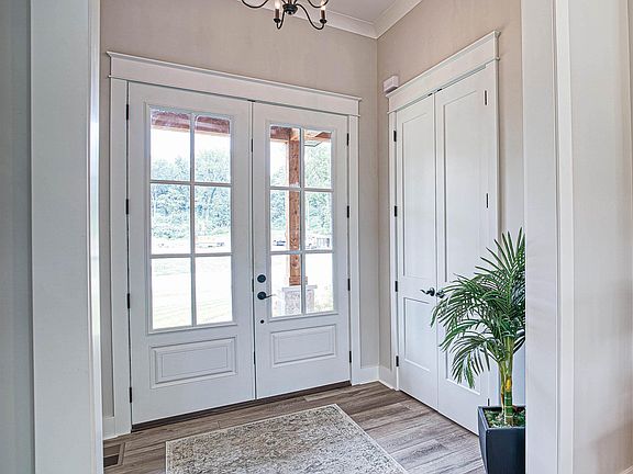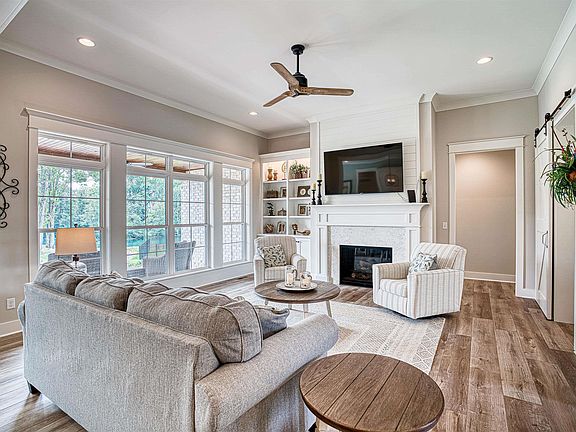 This stunning custom-built residence is perfectly situated on a picturesque lot with serene lake and walking trail views in Victoria Woods, a newly established community with a resort-like ambiance, starting with its charming covered bridge entrance. The home with 4 spacious bedrooms, bonus room, 3.5 bathrooms, and a side-load 3-car garage. The open floor plan has an abundance of natural light, creating a warm and inviting atmosphere. The foyer, with its double door entry, leads to a spacious great room featuring 11-foot ceilings, a fireplace with built-ins, and a wall of windows providing great views. The great room seamlessly transitions into a chef's dream kitchen, complete with upgraded cabinetry, a chic tiled backsplash, top-of-the-line appliances, a gas cooktop, a large island with seating, and an expansive walk-in pantry. Adjacent to the kitchen is a spacious dining area that opens to a covered porch with a tongue-and-groove ceiling and an open patio—ideal for outdoor entertaining and relaxation. The main level also features a private home office/den. The luxurious owner's suite, with its elegant tray ceiling, includes an en-suite bath with dual vanities, a custom-tiled walk-in shower, a soaking tub, and a generous walk-in closet. The split bedroom design ensures privacy, with two additional main level bedrooms sharing a full hall bath. A large laundry room with custom cabinetry and a sink adds convenience, and there’s also a practical drop zone with cubbies and a guest bath off the oversized garage. Upstairs, you'll find a fourth bedroom, a third full bath, a spacious bonus room, and a versatile flex room perfect for a home gym or playroom. This immaculate, one-owner home is set in a private wooded community with future amenities...clubhouse, pool, and community docks providing ample opportunities to enjoy an active lifestyle surrounded by the natural beauty of Victoria Woods.