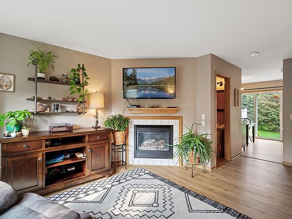 Step inside to discover a warm and welcoming main level featuring elegant engineered wood floors throughout. The cozy living room is highlighted by a gas fireplace, creating a perfect setting for relaxing or entertaining. The kitchen is a highlight, with a dining area and a patio door that opens directly to your private patio—a wonderful spot for outdoor dining and enjoying the fresh air.