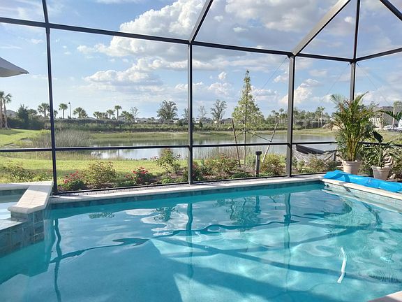 New Home, first occupied in mid November 2021. This 2500 sq ft home has 3 bedrooms, a den with a sofa sleeper and 3 bathrooms. The screened in lanai area adds 30% more living space with a private heated pool and hot tub. The master bedroom looks out on the pool with access via a sliding glass door. The large master bathroom has 2 sinks on opposite sides of the room and a large walk in shower. One section of the 3 car garage has been set up as a home gym with a weight lifting machine and dumbells. The garage area may or may not be available for the renter's car, but there is adequate room in the driveway. A pond in the back provides a nice view of nature with lots of beautiful birds and in the front is a large island of grass for a sense of space and a place to play games like crochet or ball. Sitting on the front porch is a popular past time among the friendly neighbors. The community has an active community with tennis, pickleball, basketball, children's playgrounds, a deli, several restaurants, golf course, work out facility, 2 community pools, hiking trails, bands playing on Friday nights in the town square, farmers markets, food trucks, bike trails wrapping around the large central lake and into the preserve areas, and a Publix and other public stores and restaurants at the entrance of the development. The nearest beach is Fort Myers Beach which is 35 miles away. The Boathouse Restaurant is a favorite spot for a fun meal at the marina on the Caloosahatchee river. You can find boat tours out of this marina as well. Utilities will be included up to a maximum amount. Excessive use electric and gas will be at renters expense.