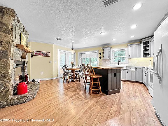 As you walk up to the inviting double-doors on the front porch you notice the new roof (2022) and twin dormers providing natural light to the living room. As you enter the massive living room, your eyes will be drawn to the beautiful stone fireplace that is also visible from the eat-in kitchen. The energy efficiency of this home keeps it nice and cool in the hot summer, but the beauty of this fireplace will provide a gentle warmth on those cold winter nights and create a festive mood during the holidays.