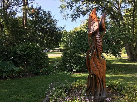 Welcome to this mid-century ranch in the heart of the metro on a 3/4 acre lot, featuring geothermal heating and cooling, steel roof, patio overlooking an enchanting back yard with fountain and an array of colorful perennials and mature trees. Entertain friends around the cozy fireplace in the spacious living room. Second fireplace in bedroom. Cut glass artwork at main entrance. Can you guess what the image is? Forbo Marmoleum on kitchen floor. Armor Cover PVC rubber flooring in the man cave garage, locust tree sculpture in the front yard, den and sunroom.