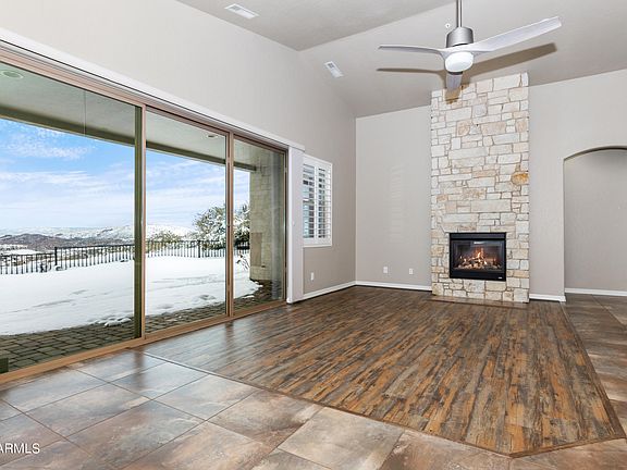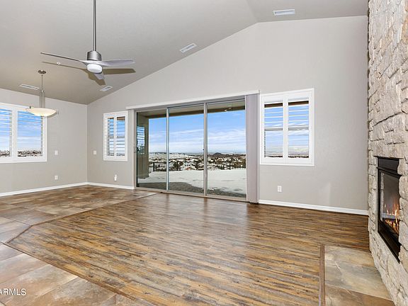 The heart of this residence is the impeccable kitchen, featuring stainless steel appliances, a stylish tile backsplash, and granite countertops. The island provides additional workspace, and a large pantry ensures you have ample storage. The open-concept floor plan seamlessly connects the kitchen with the living room and dining area. The living room, bathed in natural light, offers stunning views of Prescott. A custom sliding shade for the glass door allows you to control the ambiance, while a gas fireplace with stone accents adds warmth and character to the space.