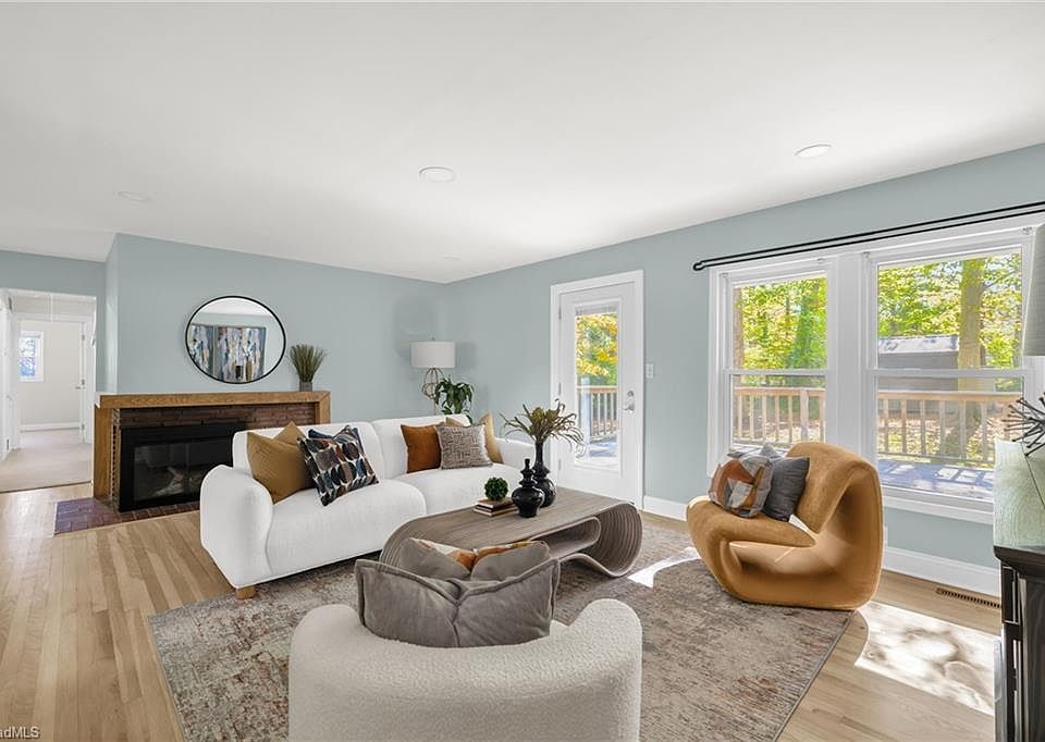 Located in Greensboro’s Kirkwood neighborhood, this updated mid-century home combines timeless style with modern comfort. The single-level layout offers four bedrooms and two full baths across 1,717 square feet, featuring refinished white oak hardwood floors and a bright, inviting living room with a custom wood mantel. A reimagined den now serves as a modern kitchen and dining area with granite countertops, tile backsplash, flat-panel cabinets, and a large island with seating. The former kitchen was converted into a practical butler’s pantry and laundry room with durable vinyl plank flooring. Additional updates include new vinyl siding, front and rear entry doors with storm doors, and refreshed lighting. Set on nearly half an acre with a fenced backyard, deck, and 10x12 storage shed, this home blends mid-century character with today’s conveniences in established neighborhood.