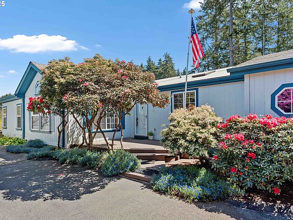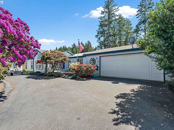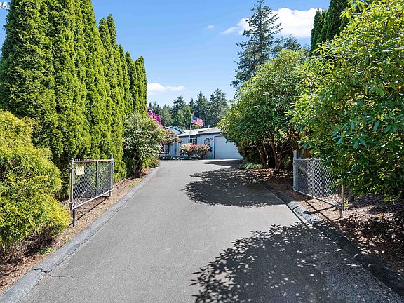 Private oasis in Lakeside, Oregon. Gated and paved, this triple wide manufactured home has a sprawling layout, light bright floor plan, vaulted ceilings, hardwood flooring, tons of built in storage, open island kitchen with stainless steel appliances and big pantry. Generous primary suite with walk in closet and attached bath. Slider to back decking perfect for entertaining, as well as a pig roasting pit! Tons of parking options, RV pad, double car attached garage with extra deep work shop area. Lot is full of flowering mature foliage - must see!