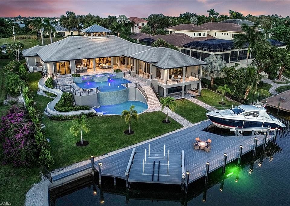 H.13734 - ONE OF A KIND!!!! IN THE HEART OF THE ESTATES WITH MINUTES TO THE GULF A 2017 YOUNG BEAUTIFULLY FURNISHED AND OF EXTRAORDINARY CALIBER ONE LEVEL SOUTHERN EXPOSURE HOME POSITIONED ON A 250' DEEP LOT WITH FEATURES THAT WILL CAPTURE YOUR ATTENTION!! YOU WILL NEVER LEAVE YOUR RESORT BACKYARD WITH A CUSTOM WATER SLIDE THAT TRANSCENDS THE 17' ELEVATION ALONG SIDE A 3 LEVEL POOL WITH INFINITY EDGES. SUN TERRACES ON EACH LEVEL. EXQUISITE 5 BEDROOMS, 5.1 BATHS, INCLUDES GUEST SUITE W/ 2 BDRMS, 2 BTHS, LIVING ROOM, REFRIG.,MICRO, DW AND WASHER AND DRYER, GAS COOKING BOTH AT THE OUTDOOR KITCHEN AND GOURMET MAIN KITCHEN, MULTI REFRIG'S, DW'S, CONTROL 4 MANAGES THE LUXURIOUS THEATER, WINE COOLER WET BAR, STUDY WITH ELEGANT BUILT IN, SUPER LARGE LAUNDRY WITH LARGE ISLAND THAT CAN BE AN CATERING CENTER OR ARTS/CRAFT STUDIO, CEILING TREATMENTS AND MOULDINGS ABOUND, IN ADDITION TO ALL OF THIS A 1200 SQFT AC STORAGE ROOM ON THE LOWER LEVEL. OVER-SIZED 4 CAR GARAGE, 30KW GENERATOR, 1000 LB PROPANE TANK BURIED, GATED AND FENCED AND SO MUCH MORE. SEAWALL 2016. DOCK W/ ONE LIFT 30,000 LB AND THE OTHER 10,000 LB HYDRAULIC LIFT FOR EASE OF KAYAKS, WAVE RUNNERS, ETC. MUCH, MUCH MORE!!!