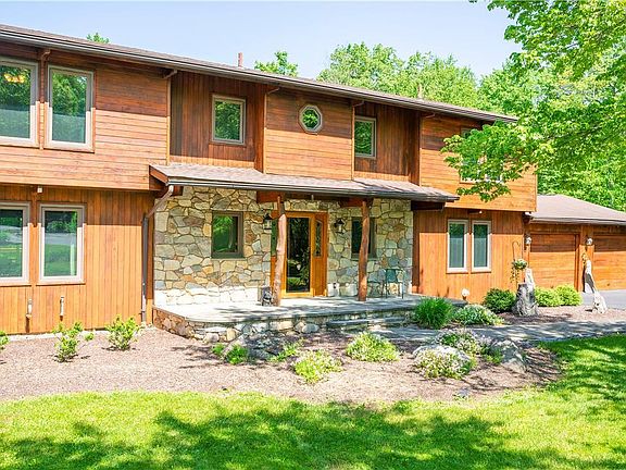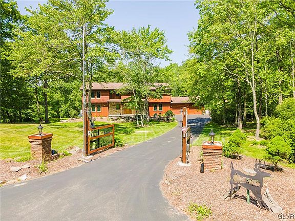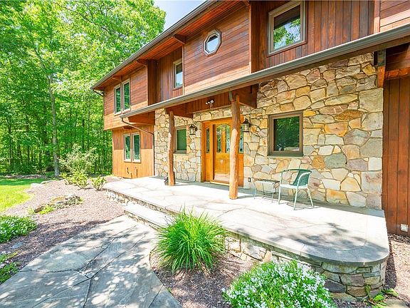 One-of-a-kind Mountain Retreat! Pass through the gates & step into nature surrounded by 3+ Acres of secluded bliss. Masterfully designed w/ natural elements, this stately 2-Story Contemporary Chalet was custom built for this specific property! From the 2nd floor balcony & the expansive deck overlooking the grounds to the stocked pond with frogs, fish & fountain, you can’t help but breathe a little slower out here. Step into the 3BR, 2.5 Ba home that feels like an authentic log cabin w/ vaulted ceilings, exposed beams, & random-width wood flooring, w/ the convenience of modern amenities like a spacious Kit. w/ granite counters & center island, 4-Season Room, Brick propane FP & 2 Car Gar. The Open Concept Main Flr features a Foyer, LR, DR, Kit & Half Ba. Ceiling fans hang from all 3 BRs, and the Primary BR Suite offers a w/ W.I.C & massive Ba. The loft showcaes an authentic pulley system for added aesthetics. Storage abounds in the unfin. LL. Located just 90 miles from NYC & PHL.