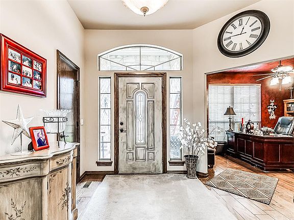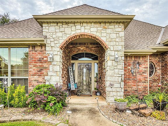 Check out this gorgeous custom home in the desired Rain Tree community in Choctaw. Check out that beautiful landscaping which is a prelude to the amazing interior features. Step into the foyer and instantly be impressed by the stunning design and rich woodwork that bring warmth, character, and timeless elegance to the home. The wood flooring continues seamlessly into the formal study, setting the tone for the craftsmanship found throughout. The spacious and cozy living room offers a beautiful tray-ceiling, large windows for plenty of natural light, canned lighting, and a large brick fireplace with custom mantle and beautiful wood framing that houses a large flat screen TV. The kitchen is a chef's dream with all built-in stainless appliances including a gas cooktop, kitchen island, granite counter tops, tons of cabinets, pantry, a peninsula with bar top seating and pendant lights and more! You can't help but notice the beautifully-designed tray-ceiling as you walk into the private and spacious primary bedroom on your way to the en suite that features double vanities, a jetted tub, shower, and walk-in closet. Check out the spacious upstairs loft-style bedroom/bonus room. Plenty of space and possibilities for this area -- easily make this a 3rd bedroom, game room, or kids play area. Did you see the other hidden bonus -- the second office nook area with built-in wood cabinets to the ceiling, drawers, and desk. One of the special features of the home is of course the spacious backyard oasis with a large covered patio, that takes you right out to the in-ground, chlorine pool. This is the perfect space for entertaining large groups of family and friends and making great memories. The home definitely provides a private rural, country feeling but yet not too far from city life as its located just a few minutes away from Tinker AFB, parks, schools, restaurants, retail stores, etc. This home is definitely a must see!! Buyer(s) are to confirm all information.