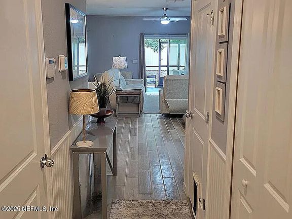 This stylish end-unit townhouse offers 3 bedrooms, 2.5 bathrooms, and approximately 1,700 square feet of comfort. Enjoy added privacy and extra windows for more natural light inside! First floor Freshly painted and a suite of tasteful design choices. The kitchen shines with subway tile backsplash, two modern orb pendant lights above the island, and updated drawer pulls for a clean finish. The main dining area is highlighted by a classic pendant chandelier. The half bath has an upgraded cabinet sink and bed board which continues throughout the 1st floor hallway into the 1st wall of the main living area. The lanai adjacent to the main living area has a new epoxy finish. More upgrades! New ceiling fans on both floors, and hanging dimmable ceiling light fixtures in the main hallway and the stairs leading to the 2nd floor. The updated master suite has an added electrical outlet in the bathroom, newly upgraded mirrors and lighting fixtures. Prime location to downtown Jacksonville!