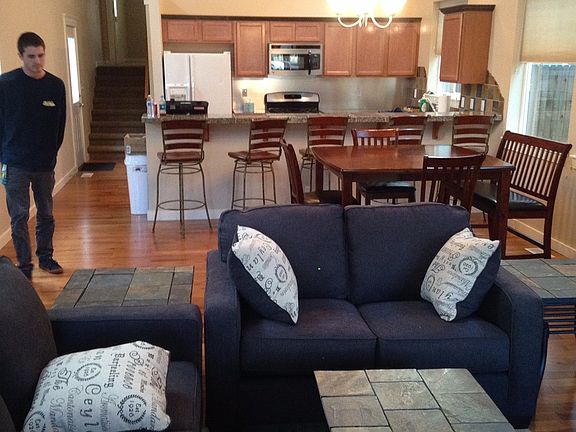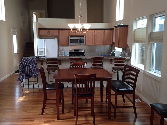 This home has soaring ceilings, hard wood floors throughout the kitchen, living room and dining room, with carpeted bedrooms. Granite counter tops in kitchen. Two bedrooms and a bathroom located downstairs with a master bedroom and bathroom located upstairs. Lots of closet space. There's also a landing at the top of the stairs that has a built-in desk and laundry area. Detached 2 car garage. Kitchen utensils, breakfast bar stools, dining table and living room furniture provided. Conveniently located to shopping, restaurants, and BSU. Owner pays for trash, sewer, landscaping and water. All other utilities by tenant.