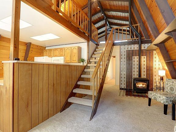 Super cute Tahoe style gambrel home well designed with plenty of windows to bring in the light. This cozy, well-maintained home features a huge room upstairs that can serve as a bedroom, family room, art studio...make it your own. Two bedrooms on main floor. Enclosed large sun room with lots of windows. Architectural angles add interest. Large 2.59 acre lot is level to rolling and features beautiful large oaks among other healthy trees. Quite and serene bucolic feel to this large lot. If you are looking for for slice of paradise, this is it.
