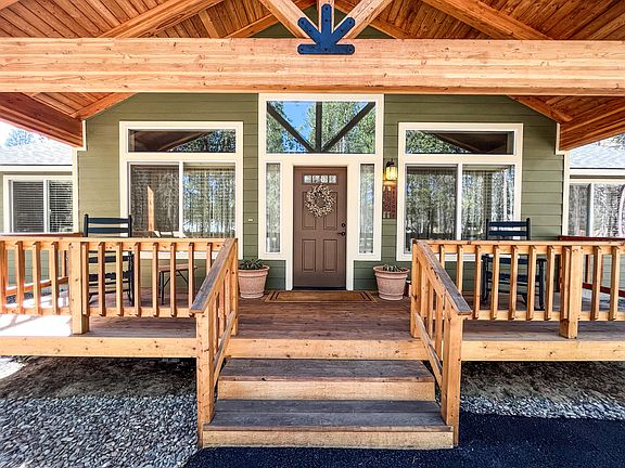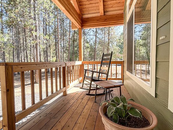 This pristine stick built home is waiting for you! The large front porch invites you to enter. Vaulted ceilings, lots of windows for light, a Lopi brand woodstove, granite counters, kitchen island, pantry and more are just some of the features in this 3 bed, 2 bath split floor plan. Large walk in shower in primary bath, plenty of closets, 2 inch blinds throughout. And then...the inviting fully fenced backyard with just the right amount of manicured lawn will conjure thoughts of relaxing in the chlorine free Jacuzzi on the large Trex deck. Paved roads lead to the paved drive where a 2 car garage and a storage shed provide a place to store your toys. With nearby grocery stores, medical facilities, post office, dining, etc. you will have more time to venture the short distance to lakes, rivers and mountains. Sunriver village is about 15 minutes north. Peace and tranquility await, come see this lovely home and make it yours!