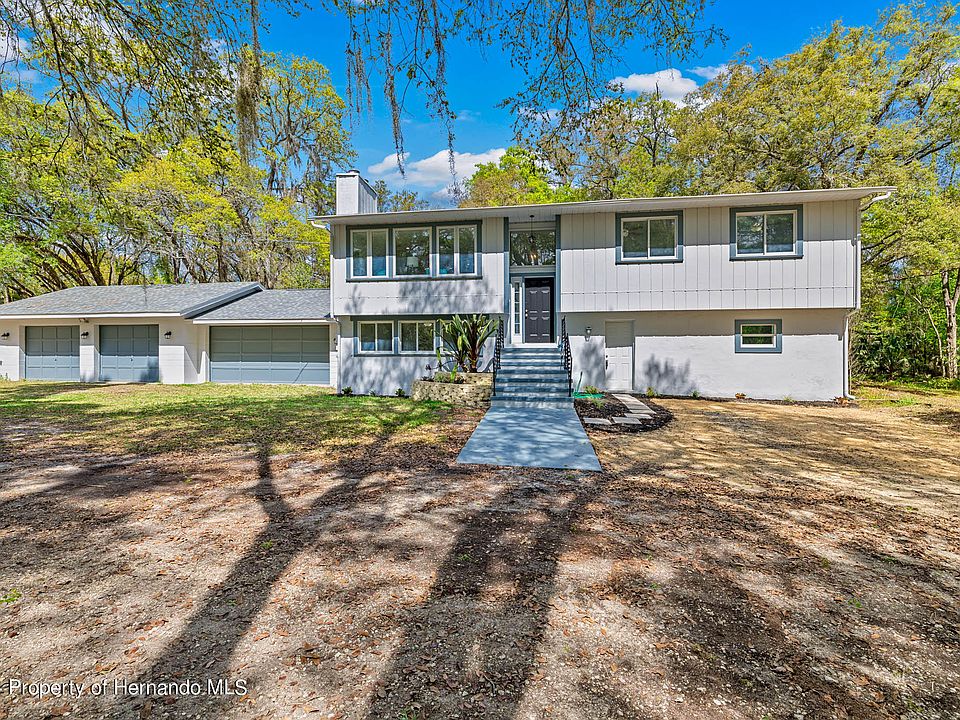 Welcome to this stunning and spacious 6-bedroom, 3 bath, 4 Car Garage home with 2,603 SF of living space! Zoned AR2. EVERYTHING has been tastefully updated!! Located in beautiful Brooksville and situated on 2.4 acres of land, this property offers plenty of space and privacy! Perfect Multi-generational Home! ROOF 2021, AC 2023, HOT WATER HEATER 2023. Step inside to find a beautifully designed interior with new exterior and interior paint, luxury vinyl flooring, and new light fixtures throughout. The kitchen features brand-new stainless-steel appliances, sleek countertops, and plenty of storage space. The bathrooms have been updated with new vanities and fixtures, adding a touch of elegance to every room. Upstairs on the second level you will find the Primary suite with ensuite bathroom, two guest bedrooms, one guest bathroom, kitchen and living room with wood burning fireplace. Including an expansive screened in porch! On the main level there are three guest bedrooms, one guest bathroom, living room with wood burning fireplace, laundry room and access to the 4-car garage. Garage includes a double bay and two single bays, perfect for all your toys or just extra storage space. Outside, the property is fully fenced, providing security and privacy for your family and pets. Enjoy the large yard for outdoor activities and gatherings. Only a short drive to the Suncoast Parkway for easy commuting to grocery stores, restaurants and Tampa international airport. Every detail of this home has been meticulously updated and renovated - everything is new and waiting for you to make it yours. Don't miss out on this incredible opportunity - schedule a showing today!