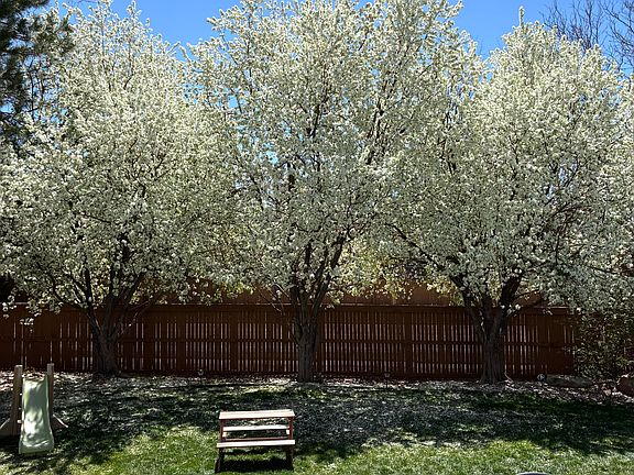 The front yard is low- maintenance xeriscaped, while the backyard will greet you with blossoming trees and beautiful perennials in the spring!