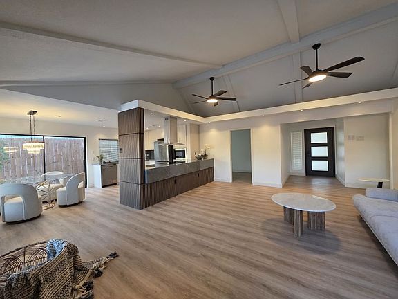 This completely remodeled 4-bedroom, 2-bath home combines modern design with a bright open layout and luxury upgrades throughout. The spacious living area features vaulted ceilings, a sleek electric fireplace, and brand-new flooring. The kitchen has been fully redesigned with quartz waterfall island, custom wood accents, new cabinetry, lighting, and stainless steel appliances.