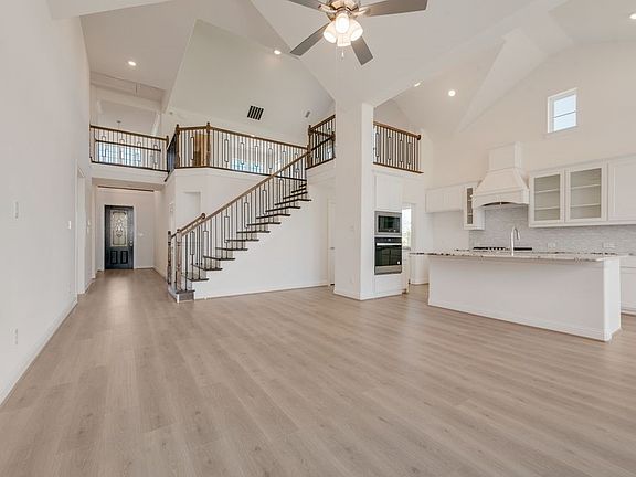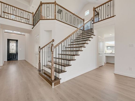 The spacious primary suite is a peaceful retreat, complete with a spa-inspired bath featuring a freestanding soaking tub, dual vanities, and a tiled glass shower. Throughout the first floor, you'll notice upscale touches such as eight-foot doors, a full oak staircase with wrought iron spindles, and designer finishes. Upstairs, a generous game room or children’s retreat offers flexible living space.