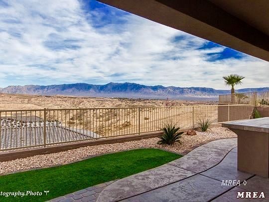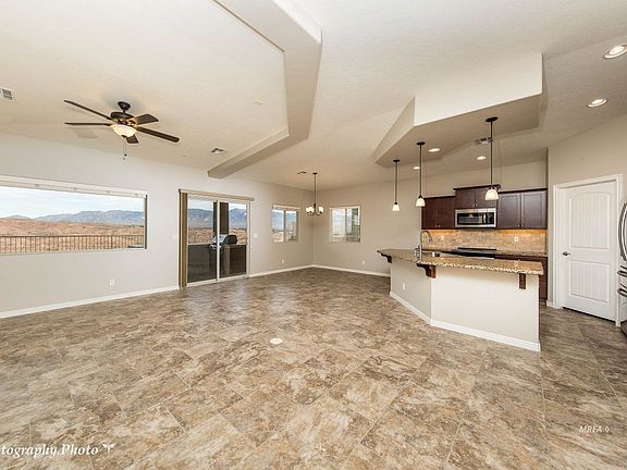 The home is situated on an elevated premium home site offering an expansive view of the eastern & southern mountains, natural desert scape and distant Wolf Creek fairways. The outdoor space is incredible with a spacious covered patio, built in BBQ and a large eating bar that hosts one of Mesquites most beautiful desert back drops. The exterior of the home is attractive with substantial rock detail, low maintenance landscaping and beautiful brick paver walkways. The upgraded interior won't disappoint. The room sizes are generous and the floor plan is desirable. Custom tile runs through out the home and warm paint tones, rich cabinetry and attractive finishes add sophistication. Large picture windows frame the incredible view from the great room & kitchen. Stainless appliances, including a costly French Door Refrigerator, R/0, upgraded large single basin sink, an oversized walk in pantry and a custom Travertine backsplash are just a few of this homes awesome features. The oversized 3 car garage is almost 1000 square feet w/ an epoxy coated floor offering plenty of space for toys, golf cart and/or storage.