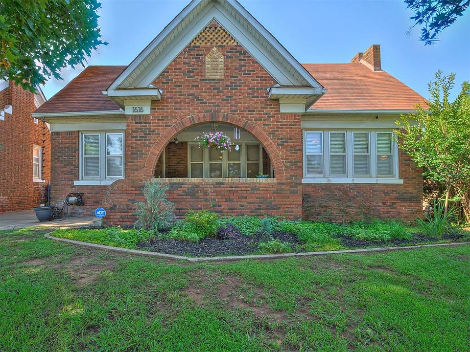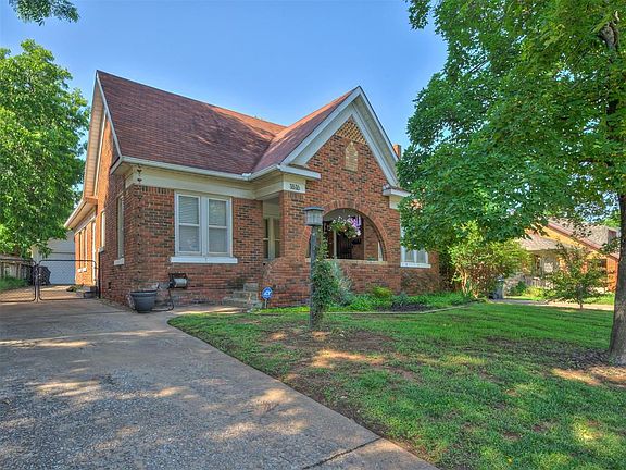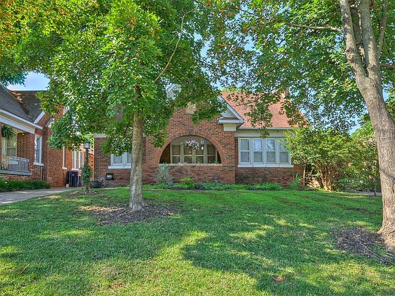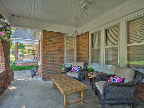 The inviting covered front porch, framed by distinctive arched masonry, creates the perfect setting for unforgettable moments, whether you're soaking in a vibrant Oklahoma sunset or relishing a peaceful rainy day. Inside, the living room has original hardwood floors and a vintage tile fireplace, setting a tone of refined comfort, while an elegant archway leads you into the formal dining room. The kitchen blends the home's timeless charm with modern updates, including a stainless steel gas stove and dishwasher, while the adjacent breakfast nook feels open and airy.