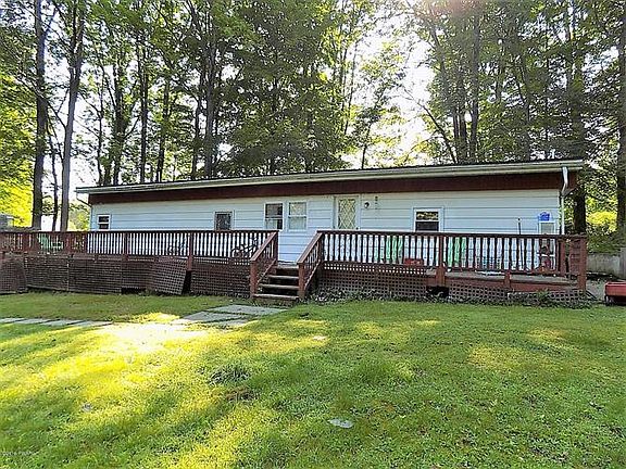 Very Affordable 2Br, 1 Ba Mobile Home on 2.9 Very Private Acres on a Block Foundation. Home is set back off the road for Privacy! 2-Car Detached Garage with storage above! Both Home and Garage have steel roofs! Includes an Outdoor Wood Stove! Located within a few minutes to Lake Wallenpaupack, I-84 and Shopping. Wallenpaupack Area School District!