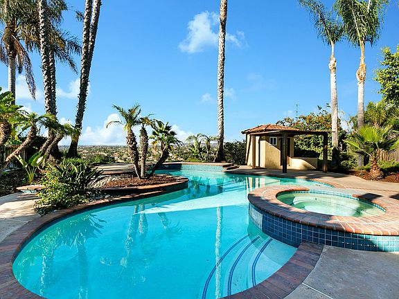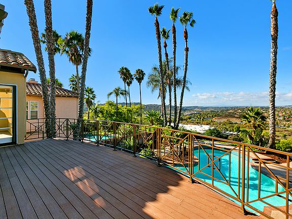 Secluded cul-de-sac location overlooking Encinitas. Looks like a one-story home until you walk through the french doors into a great room with a view of the pool and a view that goes on forever. Master located on this level as well as a den and the kitchen. Balcony is a great place to relax and enjoy the view. Down the winding staircase to another great room with a fireplace (there are three in all) that leads to the patio which has a huge pool, plenty of counter space, BBQ and refrigerator for entertaining guests. There is a grassy area beyond the pool for the kids to play and an outdoor bathroom. Three more bedrooms and two full baths are on this floor, one a private master with an amazing view as well. Kitchen wall can be removed to expand the family lifestyle great room and the bathrooms updated and new LED lights installed, new carpet and freshly painted inside and out and termite repairs and tenting completed.