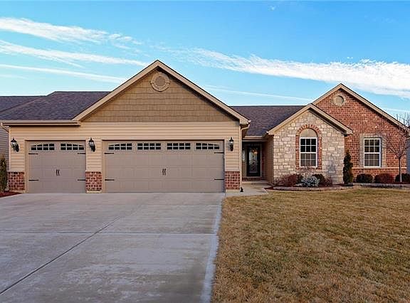 Stylish ranch located in sought-after Hannah Ridge Subdivision built by Trademark Custom Homes! This 3 bed, 2 full bath offers impressive upgrades: vaulted ceilings, brick mailbox, oversized 3-car garage w/ drywall/insulation & carriage-style doors, gas fireplace w/ brick & stone, popular Cayman Style doors, main floor laundry, walk-in closets, bay windows, arched hallway, ORB fixtures & door knobs plus a gourmet kitchen w/ SS appliances, modern tile backsplash & 42" staggered cabinets. Mastersuite features lux bath w/ double sinks, separate tub/shower & spacious walk-in closet. Let's not forget about the beautiful exterior w/ jumbo brick/stone front, shake vinyl & outdoor soffit lighting as well as a professionally landscaped yard w/ irrigation system that is perfect for entertaining family & friends. There is also an unfinished walk-out basement ready for your finishing touches! Don't miss out on this quality home. Close to shopping, dining & award-winning Wentzville schools!