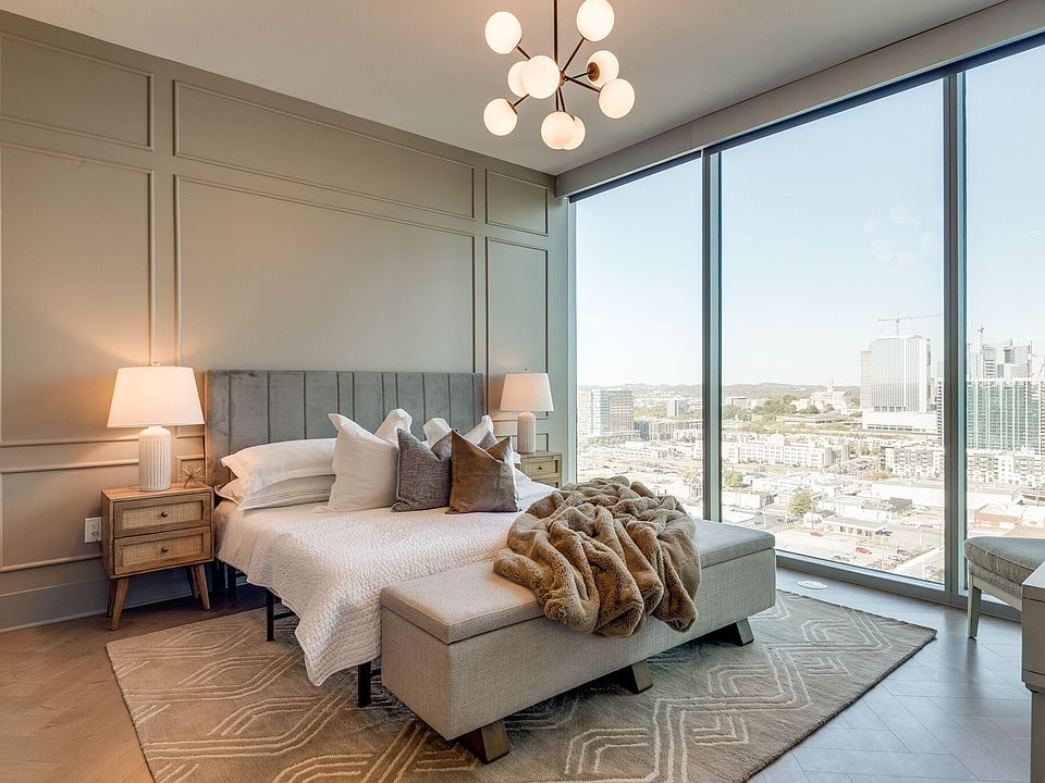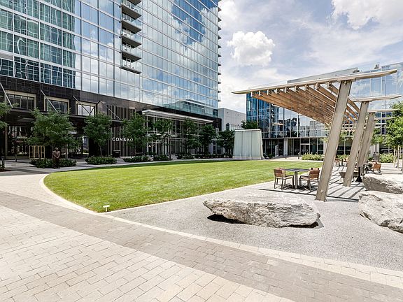 One of largest 2 beds in Broadwest. Foyer leads to open living area with herringbone floors & upgraded light fixtures & paint. Living room is made for entertaining with built in wet bar that coincides with kitchen finishes. The kitchen is well-suited with marble countertops, farmhouse sink, & Wolf/ Sub-Zero appliances. Floor to ceiling glass boast downtown & courtyard views. Master suite is spacious & complete with his & hers walk-in closets, & private en-suite full marble bath with duall marble vanities, glass edgeless shower, & large soaking tub. Additional guest bedroom & full marble bathroom is well zoned for privacy. Electric blinds, built out closets, electrolux washer & dryer included. Conrad room & maid service. Rooftop pool/golf simulator, sauna/steam